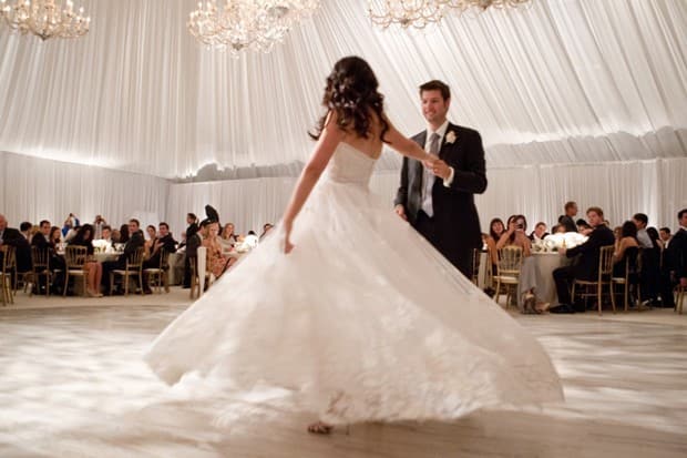 Brides often overlook the sleeves of the dress and how they can impact the flow of the First Dance. Is your dress strapless? Capped sleeves? Thin straps? Long, tight sleeves? Make sure you lift your arms and practice some of the dance moves to ensure that you can lift your arms when needed, or do the proper turns, without feeling constricted or tearing your dress. A very important note to keep in mind when getting fitted for your dress.